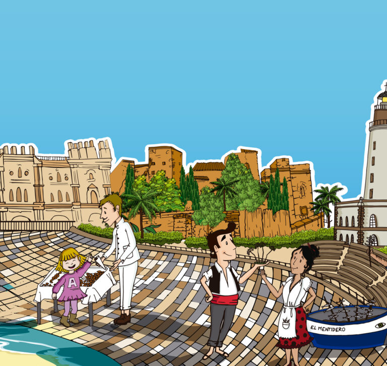Creación de ilustración donde se destacan los diferentes iconos distintivos de la ciudad de Málaga para el exterior de la carta del restaurante El Mentidero.